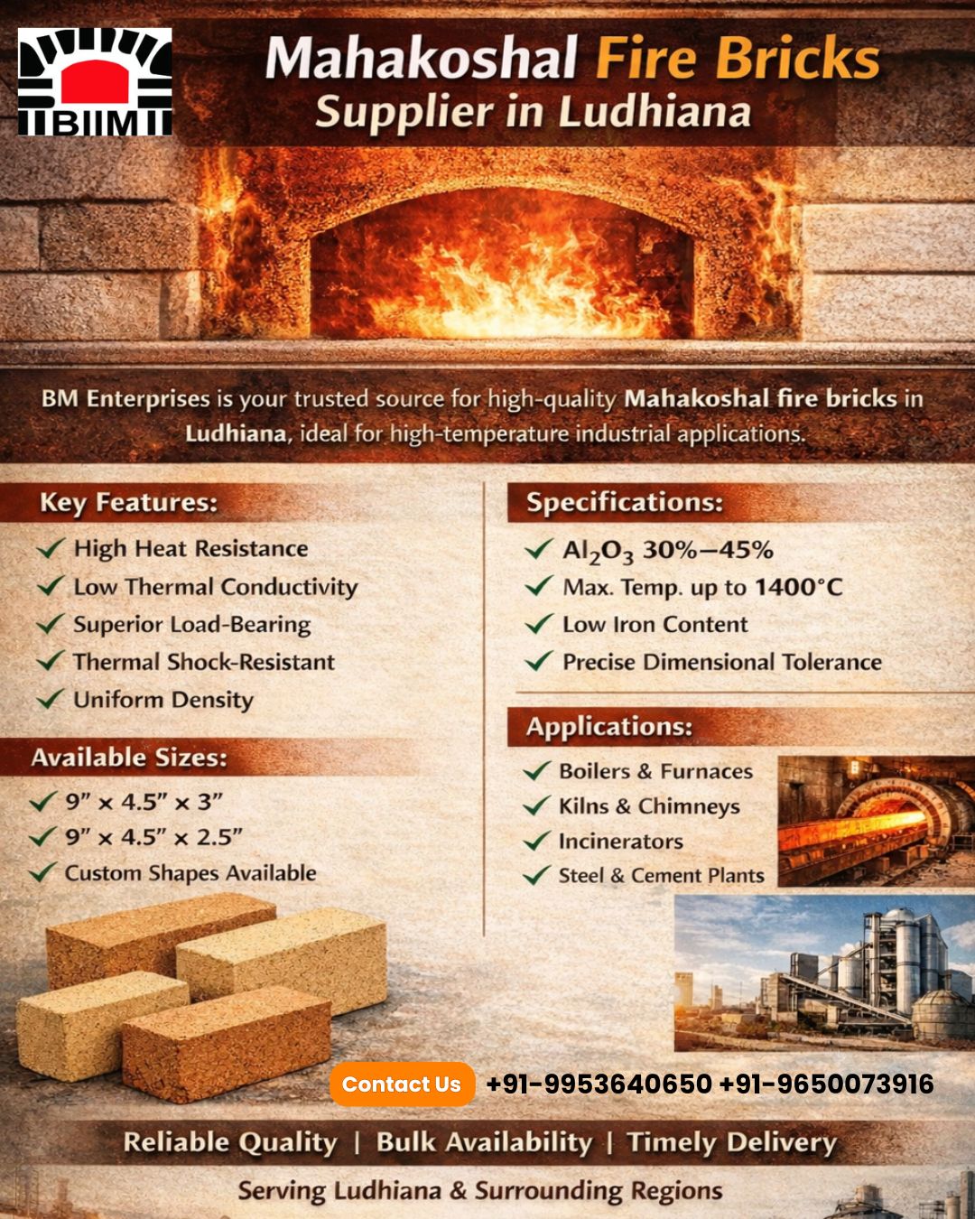 BM Enterprises stands out as a reliable and performance-driven supplier for a variety of high-temperature industries when it comes to choosing the highest quality high alumina fire bricks in Ludhiana. The company, which is well-known for providing long-lasting and thermally effective refractory solutions, offers fire bricks that are designed to resist high temperatures, mechanical strain, and chemical deterioration. They are perfect for both small-scale and heavy industrial furnace applications because each brick is made with premium-grade raw materials that guarantee a long service life, consistent insulation performance, and low maintenance needs.