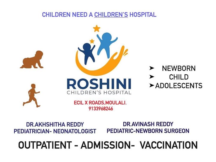 Roshini Children’s Hospital in Green Hills Colony, Moula Ali, Hyderabad provides complete pediatric and neonatal healthcare in a safe, child-friendly environment. Our services include newborn care, immunizations, well-baby clinics, pediatric surgery, emergency and intensive care, obstetrics and gynecology, and general surgery. With modern equipment, 24/7 support and experienced doctors and nurses, we ensure compassionate, family-centered treatment for infants, children and adolescents.